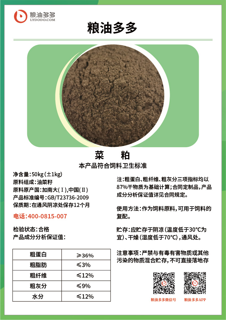 商品名称:菜粕 商品货号 : LYDD001282 品牌 : 粮油多多 产地 : 河北省唐山市 产品型号 : 菜粕 包装规格 : 50KG 等级 : 一级 生产许可证号 : 苏饲证(2019)06017