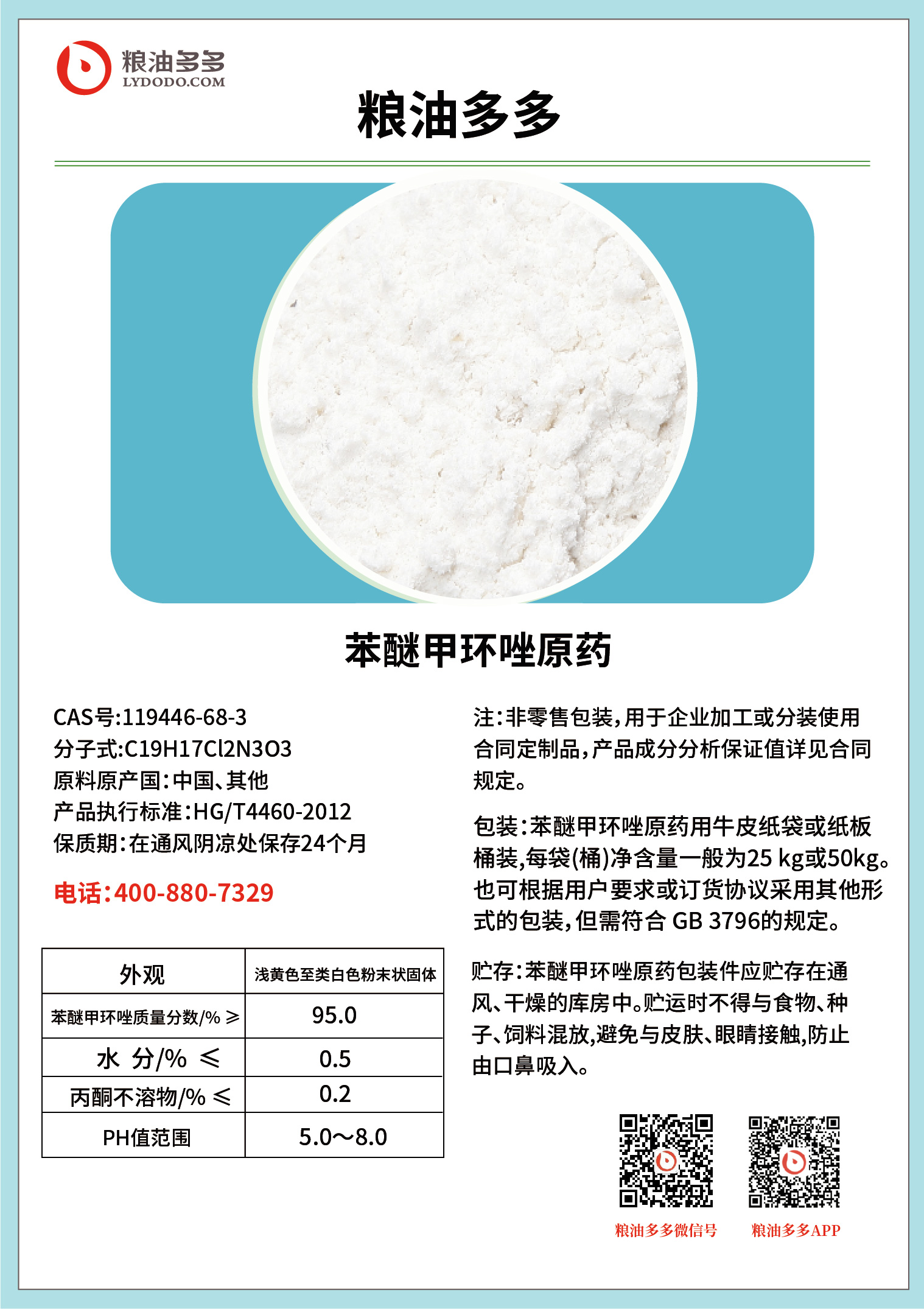商品名称:苯醚甲环唑原药T 商品货号 : LYDD001792 品牌 : 粮油多多 产地 : 江西省吉安市 产品型号 : CAS号:119446-68-3 包装规格 : 25KG/50KG 等级 : - 生产许可证号 : HG/T4460-2012